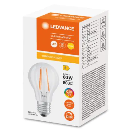 Cette ampoule Ledvance Classic LED E27 Poire Filament Claire 7.2W 806lm - 927- | Meilleur rendu de couleur - Dimmable - Remplacement 60W est l’alternative idéale pour la remplacement de votre ampoule classique de 60 W. La technologie LED intégrée vous offrira de nombreux avantages. Les ampoules à incandescence traditionnelles ont une durée de vie limitée. Cette alternative LED vous permettra de profiter d’un éclairage durable et fiable.