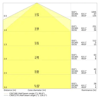 ![]() Le code couleur se compose de l'indice de rendu des couleurs (IRC) et de la température de couleur (Kelvin). Le premier chiffre indique le rendu des couleurs (1 = très mauvais rendu des couleurs, 9 = meilleure authenticité des couleurs). Le deuxième et troisième chiffre indiquent la température de la couleur. Exemple : Le code couleur "830" indique que la lampe a un bon rendu des couleurs (8) et une couleur de lumière blanche chaude (30 = 3000K). |