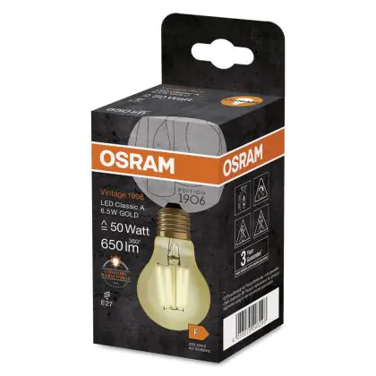 Cette ampoule Osram Vintage 1906 LED E27 Poire Filament Dorée 6.5W 725lm - 824 | Remplacement 60W avec son efficacité lumineuse de lumen par watt vous permettra de profiter d’un éclairage de qualité. Avec sa durée de vie de 15000 heures, vous n’aurez pas à vous soucier de son remplacement avant quelques années.
